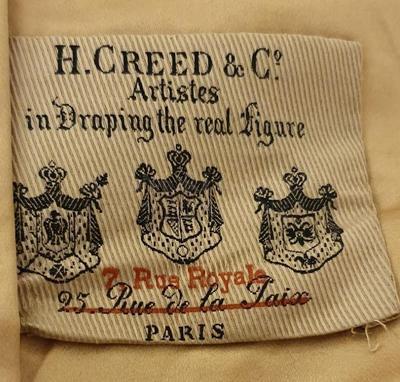 The Creed house is an English house founded by Henry Creed in the 18th century which established itself in Paris in 1854. In 1902, the house is still located at 25 rue de la Paix at the corner with the Place de l'Opéra in Paris. The Creed house was then installed at 7 rue Royale in Paris in the 1920s and 1930s. The coat of arms on the label indicates that the house provided several courtyards.