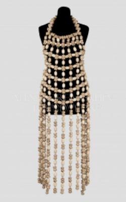 African style wooden beaded apron shaped dress, Spring - Summer 1978 haute couture collection, made up of wooden beads, some natural, others featuring a geometric pattern, connected by small metal rings and enhanced with string in places, bib held by a strap that attaches to the neck, fringed skirt with asymmetrical length.