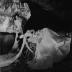 Paper photograph representing 2 dolls in a scary atmosphere wearing in a wedding dress, one is lying on a bed with a straw matella, the other is looking at her.