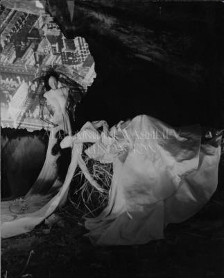 This photo shows part of the stage entitled "Ma femme est une sorcière" (I Married a Witch) imagined by the French filmmaker and painter Jean COCTEAU (1889-1963). The scene features a total of 11 ladies in long dresses inside of a burnt maid's room. Through the holes in the ceiling and walls we discover a bird's-eye view of Paris. COCTEAU creates this scene as a surreal tribute to René CLAIR's film of the same name and released in 1942. Our photo is a detail showing 2 dolls designed by Marcel ROCHAS (for the one lying on a bed) and Alix Marcelle TIZEAU (or GRES according to Geneviève PERREAU). Jean COCTEAU declare about this scene: “On an iron bed I will assleep a fainting bride, upside down. Behind her, several ladies standing in dismay". The photo was published in a double page magazine, page 22 and 23.