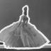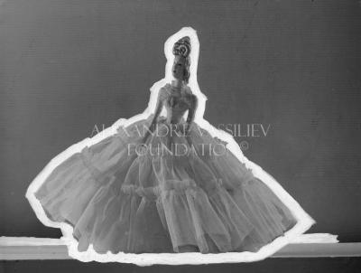 Paper photograph representing a doll on a neutral background, wearing an evening tulle dress. The white outline around the doll has been added manually as a way to make her stand out without cutting the photo in a goal to be published.