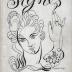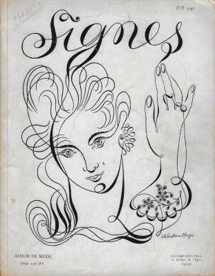 "Signes - Album de Mode", Summer 1945. French female magazine, devoted to fashion and French haute couture. Contains 68 pages (8 missing), including the cover pages. A black and white abstarct portrait of a woman by Valentine HUGO (1887—1968) illustrating the cover, colourful prints and black and white photographs illustrate articles inside.