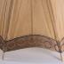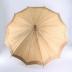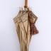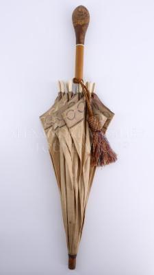 Summer parasol with wooden handle and top knob with carved chinoiserie style Asian decor with a pagoda and palma trees. The pavilion is in beige cotton with a silk border embroidered with olympic design of pink and brown interlaced rings, the ribs have bone tear shaped endings. A multicolour silk thread tassel is attached to the bottom with a rope.