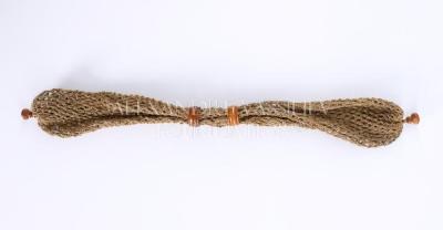 Crochet knitted miser's purse of netted vegetal fibre, decorated from both sides with small carved wooden beads, probably in coconut wood. Two same material rings serve to open and close the two compartments of the purse. The vegetal fibre comes most likely from coconut or banana.
