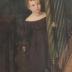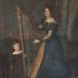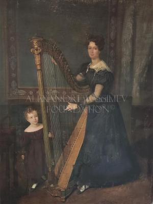 Full-length painted portrait of Elisabeth LABBEY de La ROQUE and her son Gaston MORIN de BANNEVILLE. She is depicted playing the harp and wearing an 1825-style gown composed of two part, a skirt slightly flared at the bottom with a straight waist line, and a round-necked bodice adorned with a white lace collar and puffed sleeves covered with muslin ending at the cuffs. The child wears a brown dress in the transition style (Empire to Bourbon Restoration). An inscription at the bottom of the painting indicates that it was executed from memory in 1835.