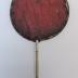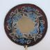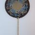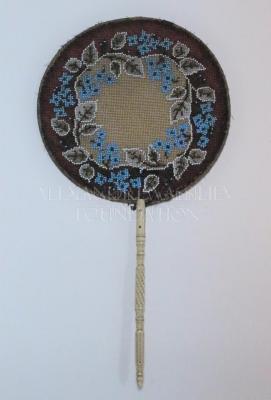 Face screen on a turned and carved bone handle supporting a round main panel decorated with burgundy and beige canvas, glass bead embroidered with blue flowers and white and silverleaves in a wreath. The fan is lined on the back with burgundy silk.