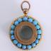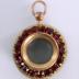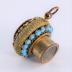 Miniature round spyglass telescope with a small integral loop for fixing it to a châtelaine or a chain as a pendant, made of pinchbeck and brass with ornate decoration, set with aventurine stones from one side, and turquoise beads from another, opens with one retractable body.