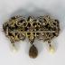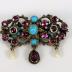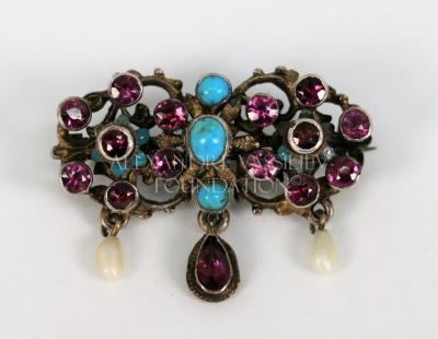 Brooch with three pendants decorated with strass imitating amethyst and turquoise. The pierced back is engraved with floral and curved motifs.