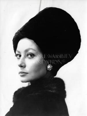 Photograph depicting a woman modelling a Jacques HEIM ensemble consisting of a black otter coat with mink fur collar, and a high toque hat. The look is completed with a pair of earrings made of large round glass stones and smaller beads in metal rings.
