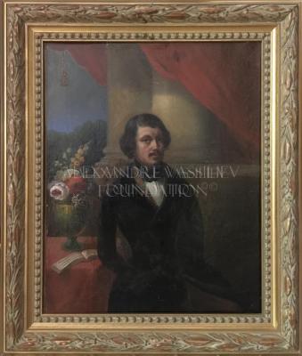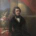 Painting portrait of a gentleman with mustache, represented standing near a table with a red cloth, an open book, and a green vase with golden ornaments and multicolour flowers. The man is wearing a black coat with tight waistline, a green and red patterned waistcoat with white shirt and a black bow tie scarf. On the background, there is a red curtain with a golden tassel, large marble columns, and a blue cloudy sky with the tops of green trees.