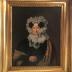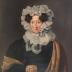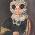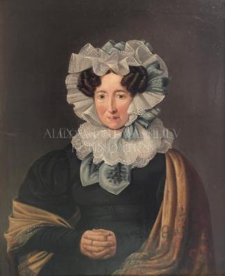 Painting portrait of a lady represented in a black long sleeved dress with gigot sleeves, matching belt under the chest, wearing a white ruffled bonnet hat with short lace trimming, attached under the chin with a wide blue silk ribbon. Her neck is adorned with the same style two-leveled collar with scallop cut border and vegetal embroideries and a blue kerchief under it. The lady is wearing a light brown colour shawl with blue red and pink floral patterns on her shoulders, and multiple rings on her fingers.