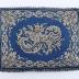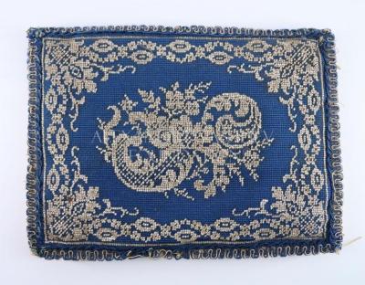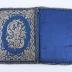 A rectangular tissue holder in blue silk muslin decorated with blue and beige trimming and a hand embroidery on the cover, made with perly bugle beads for floral design and blue cotton stitch for the rest of the space. The backside of the holder is decorated with diamond handquilting. The inner side is made of a light ivory silk with hand quilted diamonds. The construction inside is based on a cardboard paper with two layers of quilt backing fabric.