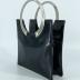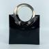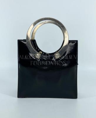 Futuristic handbag with round metal double handles. Purse made of black vinyl, has a small zip pocket inside. Clutch closing with a brass clasp.