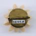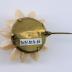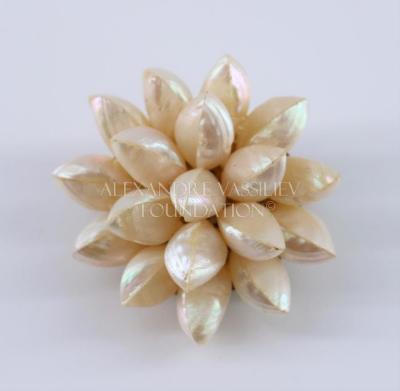 Round brooch on a brass base, entirely covered with small oval seashells, glued with each other, forming petals of a stylized flower.