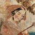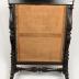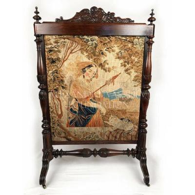 Dark carved mahogany wood fireplace screen mounted on four casters. The embroidered canvas screen with a petit point tapestry depicting fantasy scene of a young woman dressed in a orange tone dress with blue scarf, holding a banner stick and playing with a black and white cat, sitting on a wall of a castle, surrounded with tree branches with green leaves. On the background, there is a white mountain landscape and a forest.