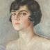 Rectangular painting portrait of a young woman, represented in an oval frame, wearing a semi transparent light purple draped gown with open shoulders, a thin chain with a tear shaped pearl embellishes the neckline. She has a short brown hairstyle with soft Marcel waves. The border is painted in lilac with dry linear stripes, imitating pastel.