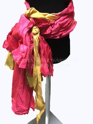 Belft made of pink and yellow satin strips. The belt is strengthened by a strip of hessian. There are nine staples on the width in order to fasten the belt, and eight staples on the length, perhaps in order to tie something to the belt.