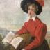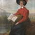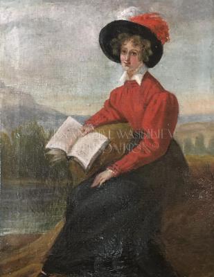 Painting portrait of a young woman represented in full-length, sitting in a Romantic landscape with a lake or a river on the background of a green forest with hills and mountains, and a blue sky with sunrise or sunset tones on the horizon. The lady is wearing a red blouse with long gigot sleeves, a white shirt under it, and a long black skirt. A black hat with red and white feathers is covering her head, with brown curls framing the face. She is holding an open book in her right hand, sign of an educated person, most certainly a poetess or a writer.