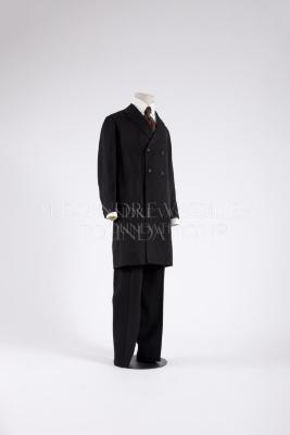 A fine black woolen cloth double breasted men's morning coat, waist-fitted, knee-length, with two rear box-pleats, secured with two buttons on the top, and a vent between them, lined with black silk.