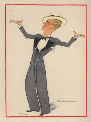 Caricature representing the singer and actor Maurice CHEVALIER (1888-1972) wearing in a black tuxedo dressed with a blazer jacket with a black satin collar (where is a red medal corresponding to his elevation to the rank of knight of the Legion of honor dated of October 1, 1938), worn with a white shirt and bow tie. He wears his famous boater on his head and stands with his arms crushed.