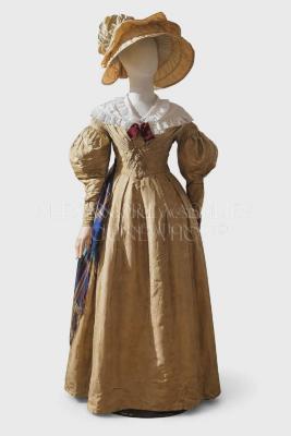 Empire style olive green silk dress with opened shoulders, long gigot sleeves, skirt pleated at the back, bodice lined with linen having hook & eye closures.