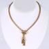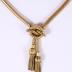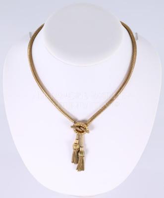 Short necklace consisting of a golden metal round snake chain, with an oval pendant imitating rope in the center, on which a short chain is knotted, ending with two tassels. The fastener is not original, and was changed later in time.