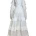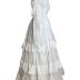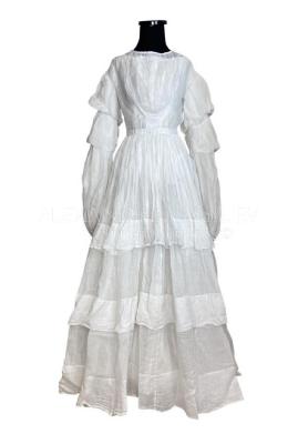 White muslin dress with narrow neckline buttoned at the back, long Mameluke sleeves and white cotton underdress with wide neckline. Gown with wide skirt with three line ruffles.