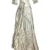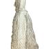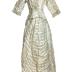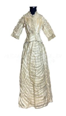 Two-piece striped ivory silk organza dress with bodice (with 3/4 sleeves and cotton lining) and a skirt with train. Gown made in two layers: First, is gathered silk organza and second is ivory taffeta. Garment bodice neckline, middle and sleeve edges trimmed with gathered ivory tulle lace.