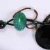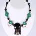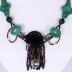 Short choker necklace made of one row of four oval green glass paste gems, with engraved bubble ornaments, linked between each other with smaller glass beads, round faceted jet beads, and long bugle type jets. The central piece is made of a large round and flat jet stone with a glass beaded tassel fringe and a round transparent faceted crystal ball.