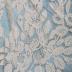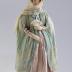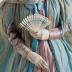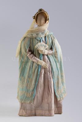 Long, sky blue silk cape covered with ivory lace tulle, tied up with ribbons in a bow on the neckline. Gown with wide collar extended at the back into a hood.