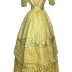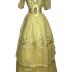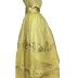 Yellow muslin and satin ball gown, the bodice with puffed short sleeves, satin trim, the tiered skirt with floss silk embroidered leaf bands and blossom. Garment with shaped satin belt with a brass buckle.