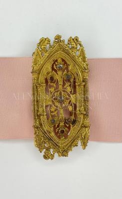 The belt buckles are becoming very fashionable under the Bourbon Restoration in France, which also corresponds to the fashion of very marked high heights and "Gigot" sleeves.