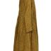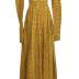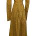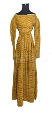 Printed silk home dress with a floral pattern on yellow base. Gown with wide neckline trimmed with ivory silk and gathered skirt on the waistline.