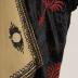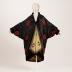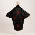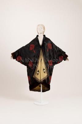 An orientalist embroidered black satin opera coat, with pink and gold chain-stitched palmettes, batwing sleeves with fur cuffs and hem, yellow moss crêpe lining with ethnic style embroidery.