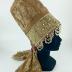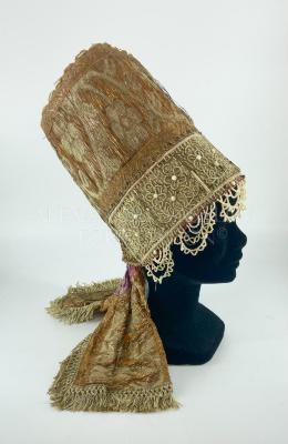 Russian headdress called "Poviazka" part of the Pomors female costume. Head gown in woven metallic and orange brocade embellished at the front with small artificial pearls and mother of pearls on metal folio and with a short ivory pearl beaded net border.