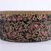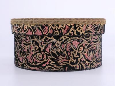 Round commercial packaging box in cardboard lined with fabric. This one forms on the outside geometrical patterns reminding floral motifs in velvet. The inside is covered with orange cotton, while the outside bottom is reinforced with green leather.