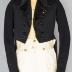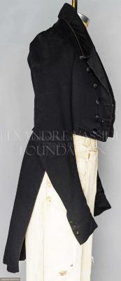Black wool tailcoat with revere collar and lapels finely hand quilted. Garment double breasted and may be worn left over right or visa-versa with black silk buttons embroidered with single black thistle, outer tail pockets, 1 hidden inner pocket.