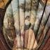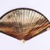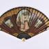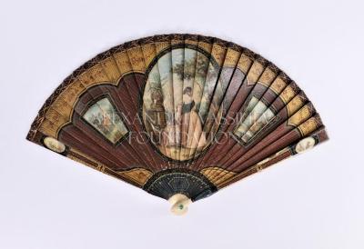 Ivory brisé fan consisting of 27 sticks with Martin's varnish painted design. On the main side: a central vignette with two ladies in a garden landscape, one sitting in a lilac dress with white fichu and white bonnet hat, and the other standing with turned back in a pink gown with dark green shawl. On the sides, two trapeze shaped medallions with landscapes of peasant architecture. The whole on the brown background with black dotted motif with straight and wavy lines, and golden colour Neoclassical framing in the early French Directory style, transitional between Louis XVI and Empire. The fan is held at the top with a black silk ribbon painted with gold ornaments. The reverse side has a painted landscape, showing a tree on the front, with a farm building or a village on the background, surrounded with forests and hills. The bottom of the handle is embellished with a green stone from each side.