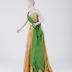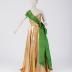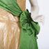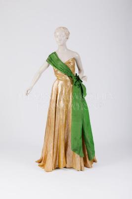 Haute couture evening dress in gold lamé decorated with wide green silk ribbon on right shoulder tightened in a bow on the waistline left-hand side and with wide free ends the same length as a skirt. Gown bodice with straps, neckline is fitted by chest darts, and with long flared skirt lined with green taffeta underskirt, gathered with three rows of casing cord. Has separate green taffeta sash, snaps closed.