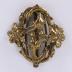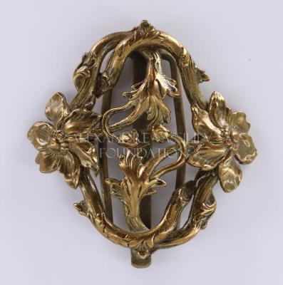 Stylized diamond shaped belt buckle in brass with openwork Art Nouveau design of two iris flowers on the sides surrounded with scrolling stems and leaves with buds. The buckle mecanism is on a clip base, fastening on the bottom.