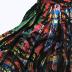 Pleated mid-length skirt in material imitating taffeta with splashes of velvet with multicoloured tartan pattern with muted tones. The tartan is covered with ink sprays in the form of glued fabric and ribbons form black bow ties to adorn the bottom of the skirt. She has a black underdress with a pleat at the bottom. Gold ribbons allow the dress to be attached to the tunic, and a zip makes it easy to put on and take off.