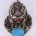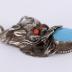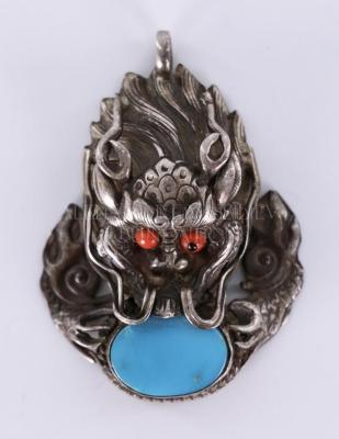 Sterling silver pendant depicting a dragon's head done in traditional Asian style, with horns, flowing whiskers, and wings. The creature's piercing eyes are made of red coral, and it is holding a flat polished oval turquoise stone in the mouth.