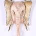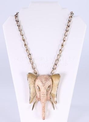 Ethnic necklace forming an elephant's head hanging from a metal chain with gold and worked links. The head is elongated with ears, eyes and tusks in gold and striated metal. The back of it is in gilded openwork. Its trunk is rolled up.
