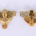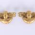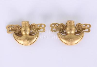 Pair of bird-shaped matte gold-coloured brass ear clips in the pre-Hispanic style, probably representing a two-headed feathered serpent.