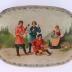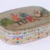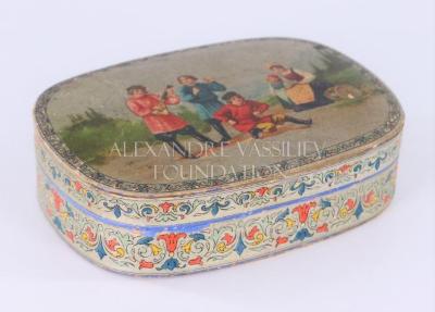 Rectangular cardboard box with rounded edges for "Russian Wafers", embellished with chromolithography representing on the top a Russian peasant scene of a young man in red shirt dancing cossack or hopak dance, with on the back one boy playing balalaika and another playing triangle. On the right, a young lady, wearing a red and blue sarafan over a white shirt, and a golden kokoshnik and apron, is sitting on a piece of wood with a young child standing near her. The sides have a repetitive pattern mixing Neo-Renaissance and Russian folk ornaments in red, blue and yellow colours on silver background.