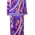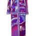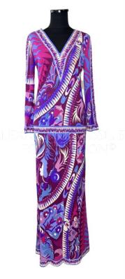 Silk jersey maxi length dress with long sleeves and deep V-neck. Printed with eclectic floral motif in pink, fuchsia, blue, violet and white colours and bordered at the neckline, center and bottom of the sleeves, hip line, hem and center back with a geometric printed band in the same colors.