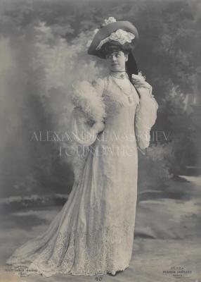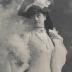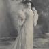 Paper photograph of a Parisian model of Maison Lambard, destined for a German magazine, with a printed on tracing paper explanatory text in German. The photograph shows a young woman dressed in a delicate linen flowing dress, in a fairy-like style, the ivory-colored tone of which is emphasized by darker tinted Irish lace inserts. The incrustation stretches over the wide flounce to above knee height. At the top, a small bolero made of the same lace forms a separation, two strings of pearls and a coral choker are combined with two brooches - one on the collar with stones, and the other rectangular in openwork metal in the middle of the chest. Sleeves with Irish lace insert and border, from which a full long puff of white silk chiffon falls to be caught again at the wrist in a tight lace cuff with its fluttering width. Tea-roses are lying seductively on the black straw hat lined with ivory-colored velvet, and a feather boa completes the look.