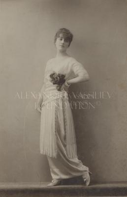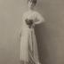 Paper photograph depicting a young woman in a fashionable gown, consisting of an ankle length fluid dress with short sleeves, embellished with a long pleated belt, creating an overskirt open on the side, with embroidered and beaded trimming, and large round buttons on the side of the silk belt on the waistline. The bodice is adorned with a large silk flower, and the lady is wearing a multistrand pearl bracelet on one hand, and a metal chain bracelet with some individual pearls on the other.