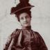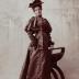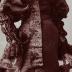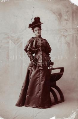 Paper photograph depicting a young woman in a fashionable outside gown, consisting of a jacket and a dress. The dress is made of a simple shiny silk fabric, accentuated on the waistline with a large embroidered belt. The same embroidery decorates the brocade jacket with large puffy gigot sleeves on the upper part, and 3 pleated lines on the lower sleeves ending with a ruffled cuff. The look is completed with a flat hat with ostrich feathers decoration.