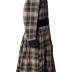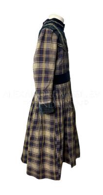 Woolen tartan girl's dress with dark green velvet waistband, cuffs and stand collar, and chest details embellished with beads on the edges.